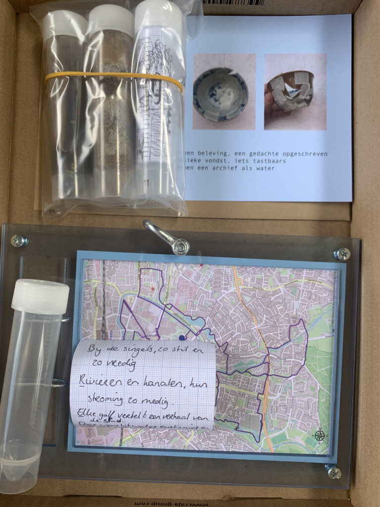By collecting objects from various situations, an impression of the past begins to emerge. “It’s not just about what you find, but the circumstances in which the object is found.” This context gives an archaeological find its meaning, and allows us to map out something that has occurred. During this project, a collection was created over four days in collaboration with 50 walkers. Each day, different materials were gathered. On the final day, all the discoveries were mapped and displayed as an archive at the end point of the four-day walk